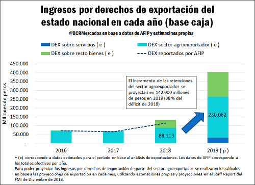 «En esta cifra se incluyen granos, harinas, aceites, biodiesel y el resto de los bienes que exporta la economía. Sumando los derechos a las exportaciones de servicios sujetos a retenciones, proyectados en 8000 millones de dólares, el ingreso por derechos de exportación alcanzaría un total de 404.000 millones de pesos, cifra similar al valor reportado en la Ley de Presupuesto 2019″, indicó.