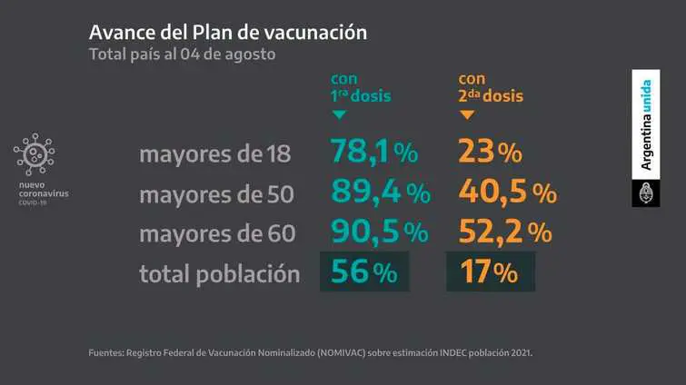 “Esto es un logro colectivo. Tenemos el 80% de la personas mayores con al menos una dosis. Nuestra prioridad es aumentar las segunda dosis priorizando a las personas mayores de 50 años. En agosto vamos a aplicar mas de 7 millones de segundas dosis. . Además, seguiremos aplicando las primeras dosis a los y las adolescentes entre 12 y 17 años que hayan sido priorizados”, añadió.