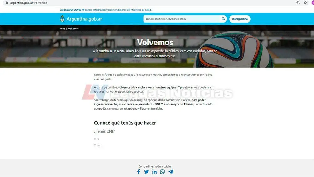 El Gobierno nacional ya habilitó el sitio web para tramitar el permiso o certificado digital para volver a las canchas de fútbol a partir de mañana, cuando comenzará a regir la habilitación del 50% del aforo de cada escenario con la aplicación de protocolos sanitarios a raíz de la pandemia de coronavirus.