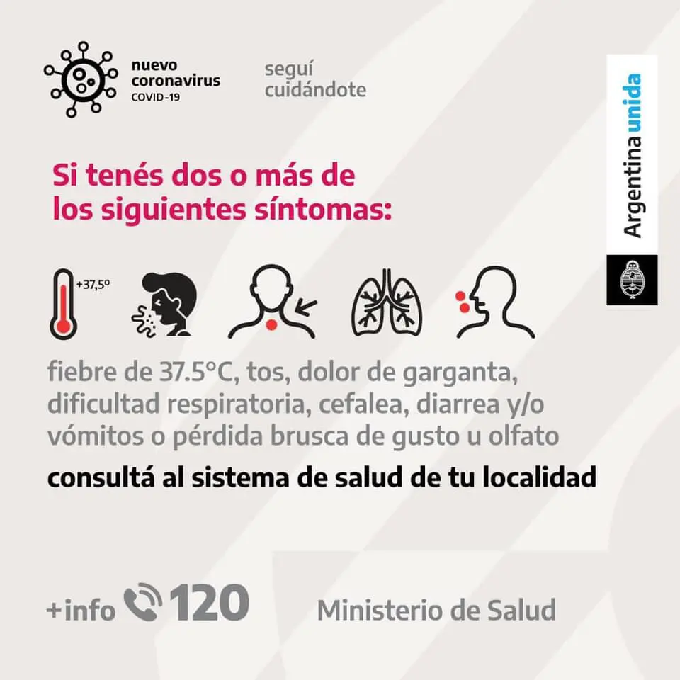 De esta forma, estos tres síntomas se suman a los de fiebre de 37.5 Cº o más, tos, dolor de garganta, dificultad respiratoria, falta de olfato o gusto (anosmia/disgeusia), sin otra enfermedad que explique completamente el cuadro clínico, según se informó oficialmente.