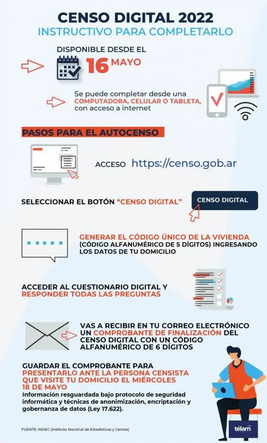 Desde el próximo miércoles, quienes quieran censarse de modo anticipado podrán hacerlo a través del cuestionario digital que dispondrá el Indec, al que se podrá acceder desde un móvil, computadora u otro tipo de dispositivo electrónico y cuyo comprobante de realización deberá mostrarse al censista que concurra al domicilio el 18 de mayo, cuando se realice el registro estadístico de modo presencial en simultáneo en todo el país.