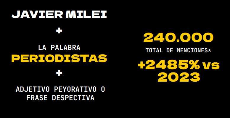 Un estudio específico de la consultora Methodo para FOPEA, basado en más de 2,4 millones de interacciones, concluyó que las agresiones del poder multiplican la violencia virtual contra la prensa. Las menciones peyorativas sobre el periodismo por parte del presidente Milei y cuentas afines sumaron 240.000 en 2024, un 2000% más que en 2023. Cada ataque verbal del mandatario genera un efecto multiplicador en las redes, instalando un clima hostil.