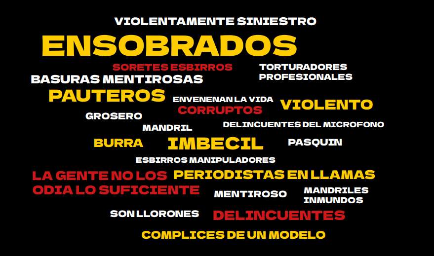 El estudio de la consultora generó una nube de palabras a partir de los términos y adjetivos usados por Milei y otros usuarios contra la prensa. Esta nube (visible en el gráfico adjunto) representa visualmente la frecuencia de uso: las palabras más repetidas aparecen en mayor tamaño. Entre los términos más destacados figuran «ensobrados», «pauteros», «imbéciles», «violento», «burra» y la frase «periodismo en llamas». Con menor frecuencia, se observan otros como «esbirros», «corruptos» y «soretes».