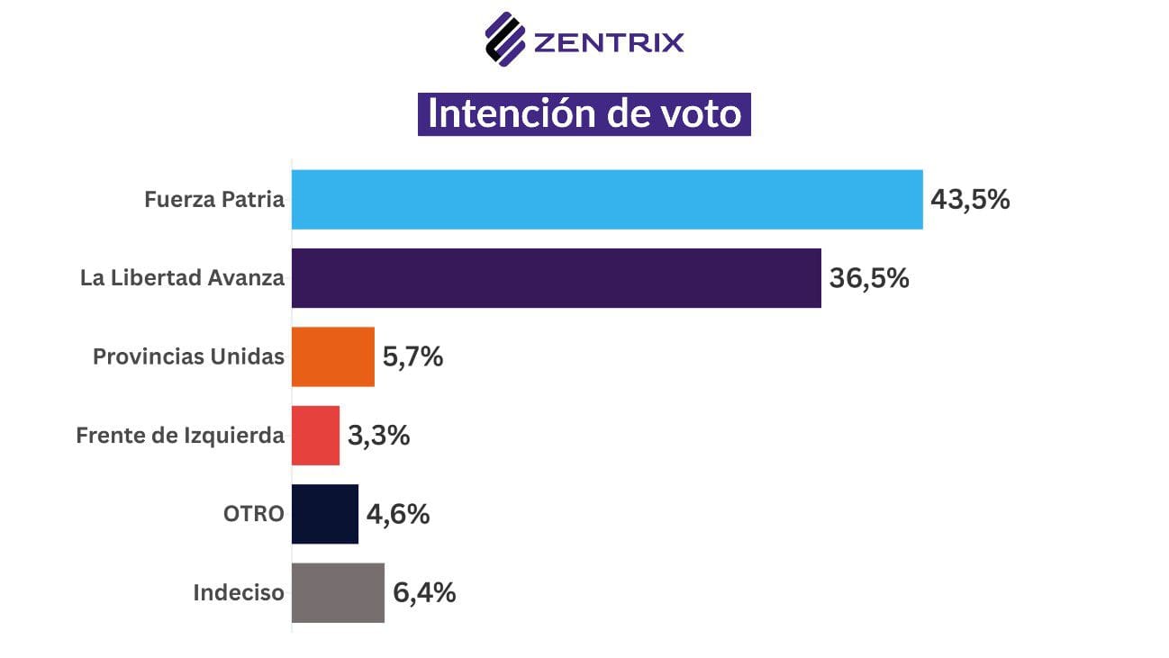 La intención de voto de cara a las elecciones legislativas del próximo 26 de octubre muestra un crecimiento significativo de Fuerza Patria, que alcanza el 43,5%, es decir un crecimiento de 2 puntos respecto a la medición de septiembre. Por su parte, La Libertad Avanza sube al 36,5%, frente al 35,4% previo.