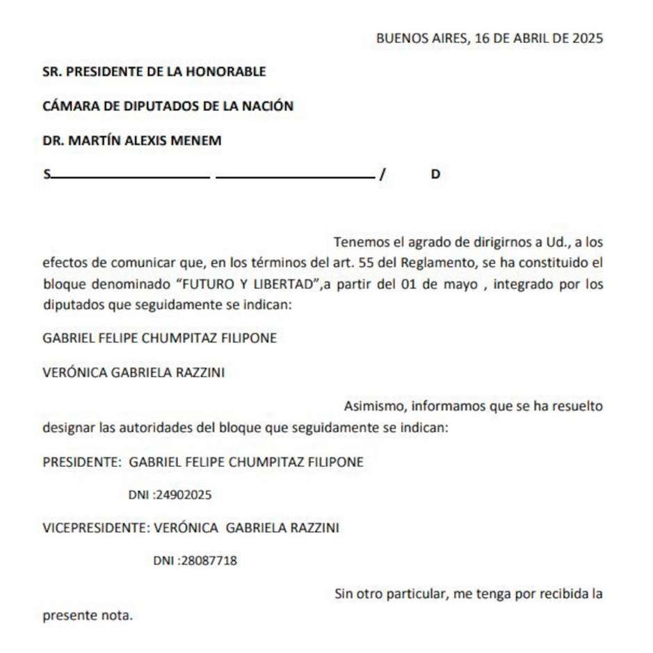 La ruptura fue formalizada el 16 de abril de 2025, mediante una carta dirigida al presidente de la Cámara de Diputados, Martín Menem, en la que ambos legisladores santafesinos solicitaron la conformación del nuevo bloque parlamentario. Con este movimiento, el PRO pierde dos de las 37 bancas que poseía hasta ahora en Diputados, en un momento de fragilidad interna y presión externa por parte del oficialismo nacional.