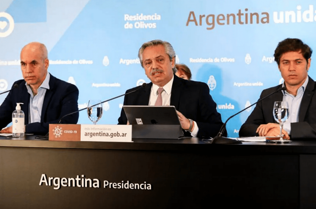 El mandatario realizó el anuncio de la extensión de la cuarentena hasta el 24 de mayo en la quinta de Olivos, acompañado por el gobernador bonaerense, Axel Kicillof, y el jefe de gobierno porteño, Horacio Rodríguez Larreta, que gobiernan en los distritos donde se concentra más del 60% de los casos de coronavirus en todo el país.