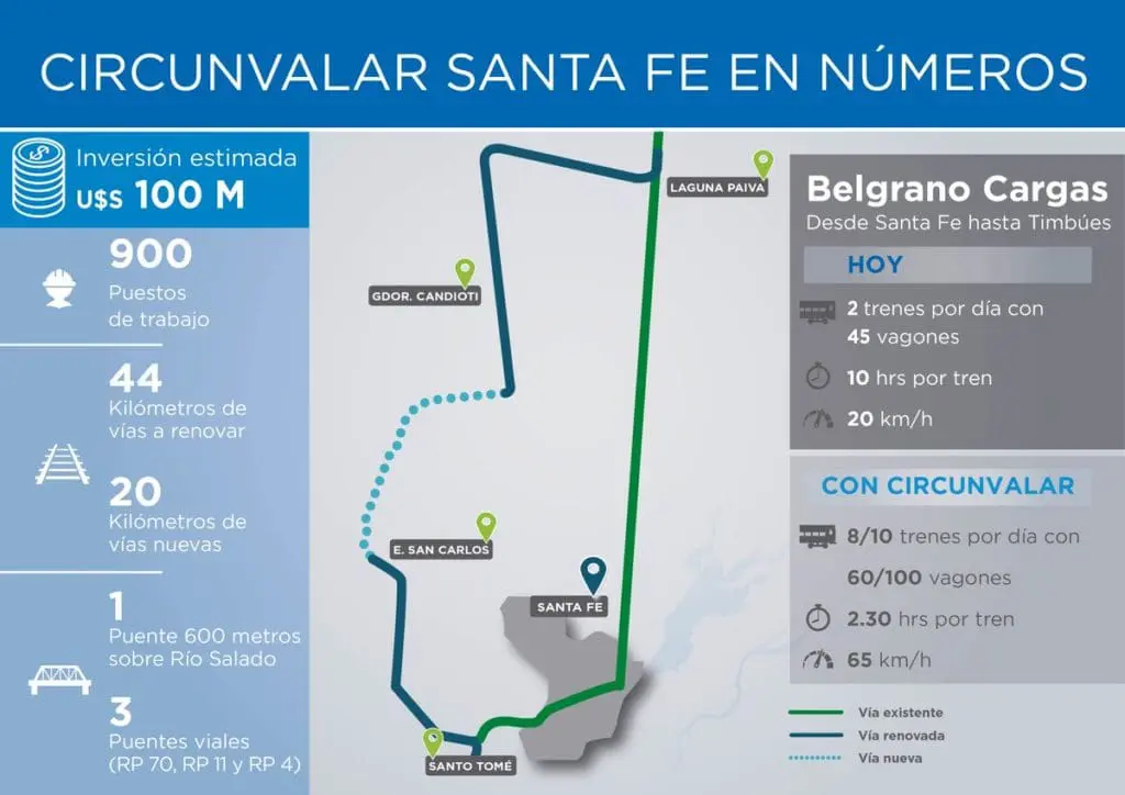 Con la nueva circunvalación ferroviaria a Santa Fe, el tren de cargas dejará de circular por la ciudad, eliminándose tiempos de espera en los cruces ferroviarios y generándose una transformación inédita en el ejido urbano de la ciudad, surcado hoy por 62 pasos a nivel. La obra generará 900 empleos, en un plazo estimado de 2 años y medio.