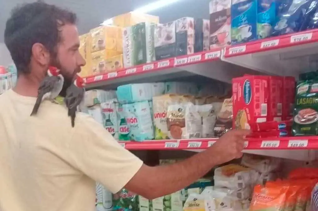 Jonatan Fantin anda en bicicleta por las calles de Urdinarrain con dos cardenales posados en su hombro. También lo acompañan a hacer las compras y cuando llega de trabajar, lo reciben cantando.