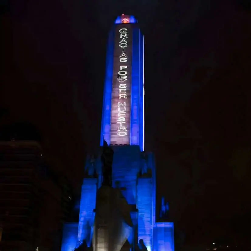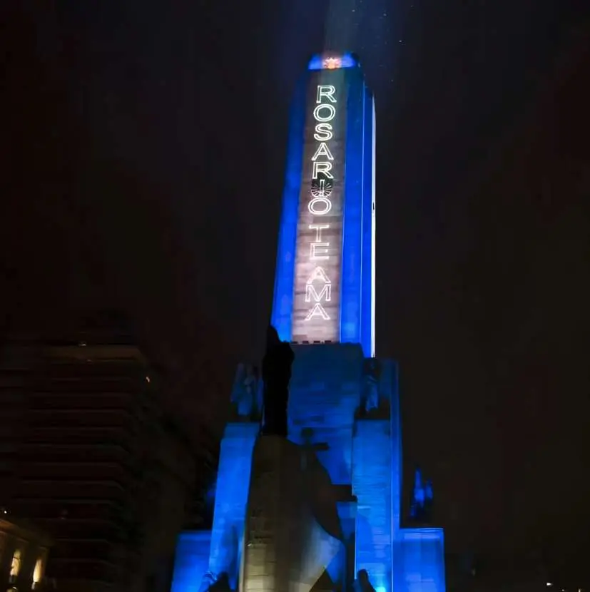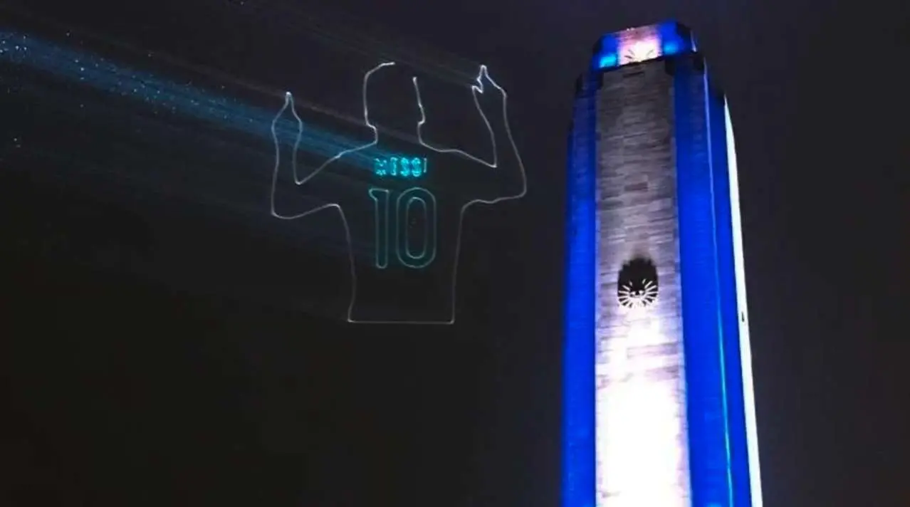 De esta manera, al igual que ocurrió en la previa del mundial, y posteriormente con la obtención de la Copa del mundo, además de la iluminación celeste y blanca, el principal ícono de Rosario volvió a estampar el nombre de Messi.