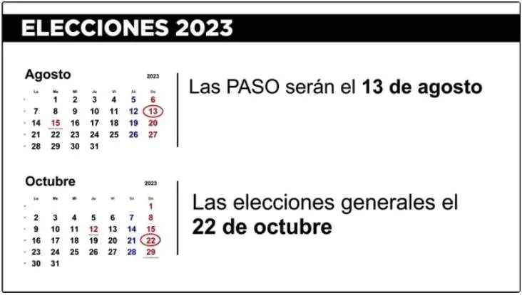 Las elecciones generales serán el domingo 22 de octubre, con la participación de los candidatos a presidente por cada uno de los espacios políticos. En caso de darse una segunda vuelta o balotaje, será el domingo 19 de noviembre.
