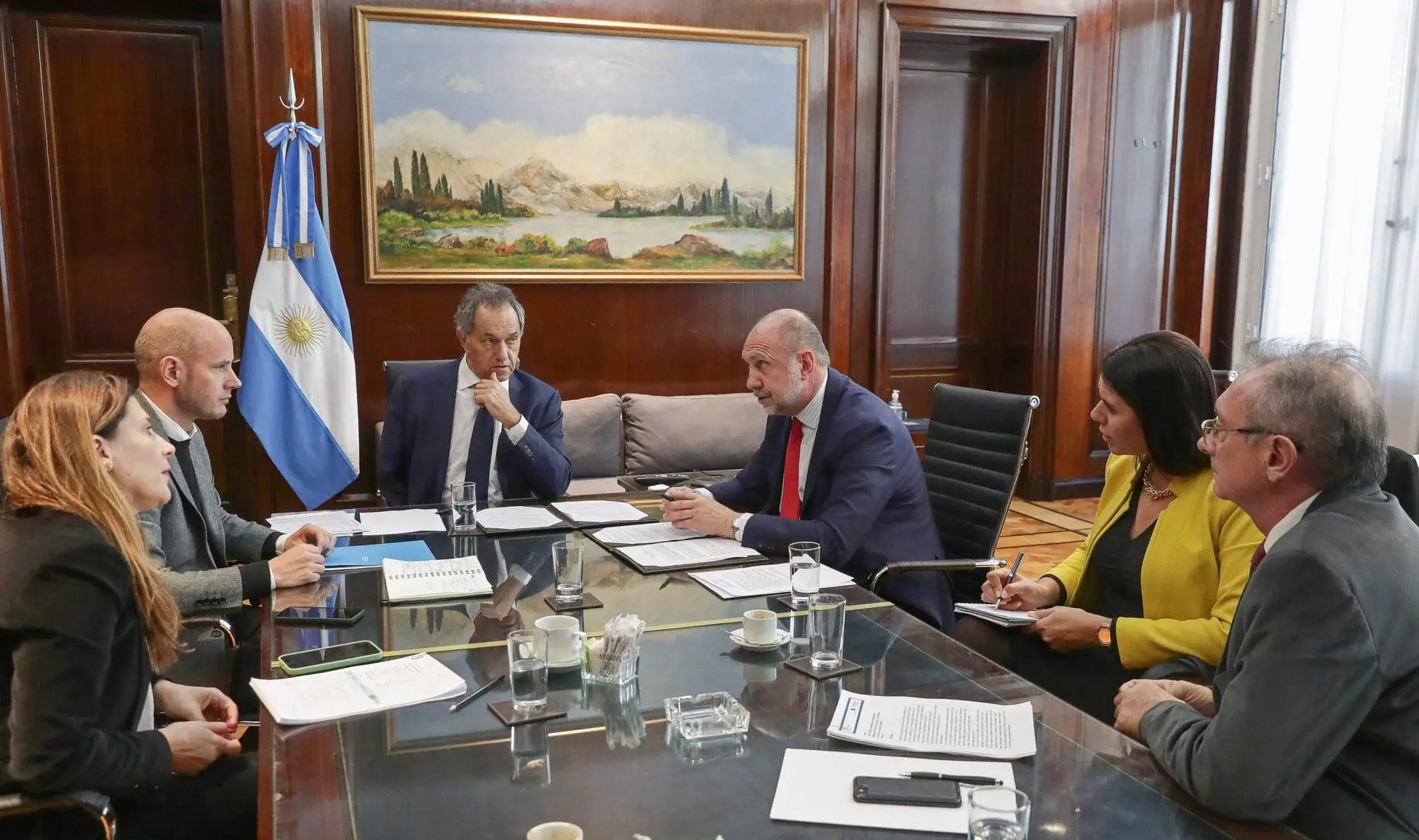 El gobernador de Santa Fe, Omar Perotti, mantuvo una reunión con Daniel Scioli, ministro de Desarrollo Productivo, en la sede ministerial de Ciudad de Buenos Aires, el 13 de Julio, 2022.