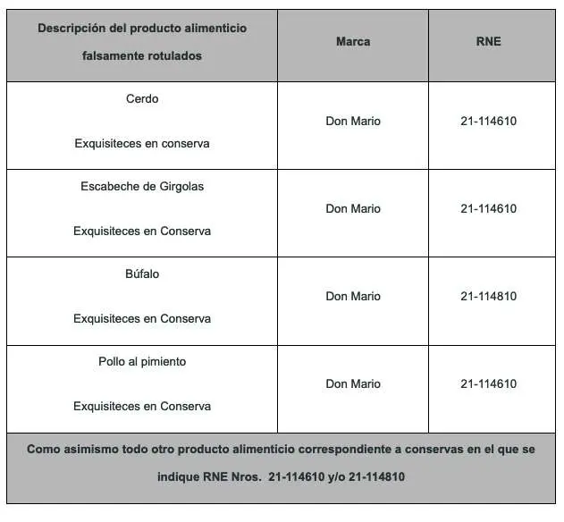 El Ministerio de Salud, a través de la Agencia Santafesina de Seguridad Alimentaria (Assal), prohibió la elaboración, tenencia, fraccionamiento, transporte, comercialización y exposición, en todo el territorio nacional los productos alimenticios rotulados Conservas marca Don Mario.