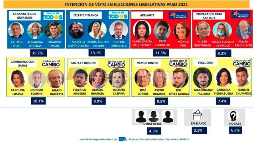 Santa Fe (pesa casi 8,4% del padrón nacional) presenta una de las situaciones más competitivas, con tres fuerzas que tienen internas: el FdT (2 listas), JxC (4 listas) y el Frente Progresista (FP, 2 listas).