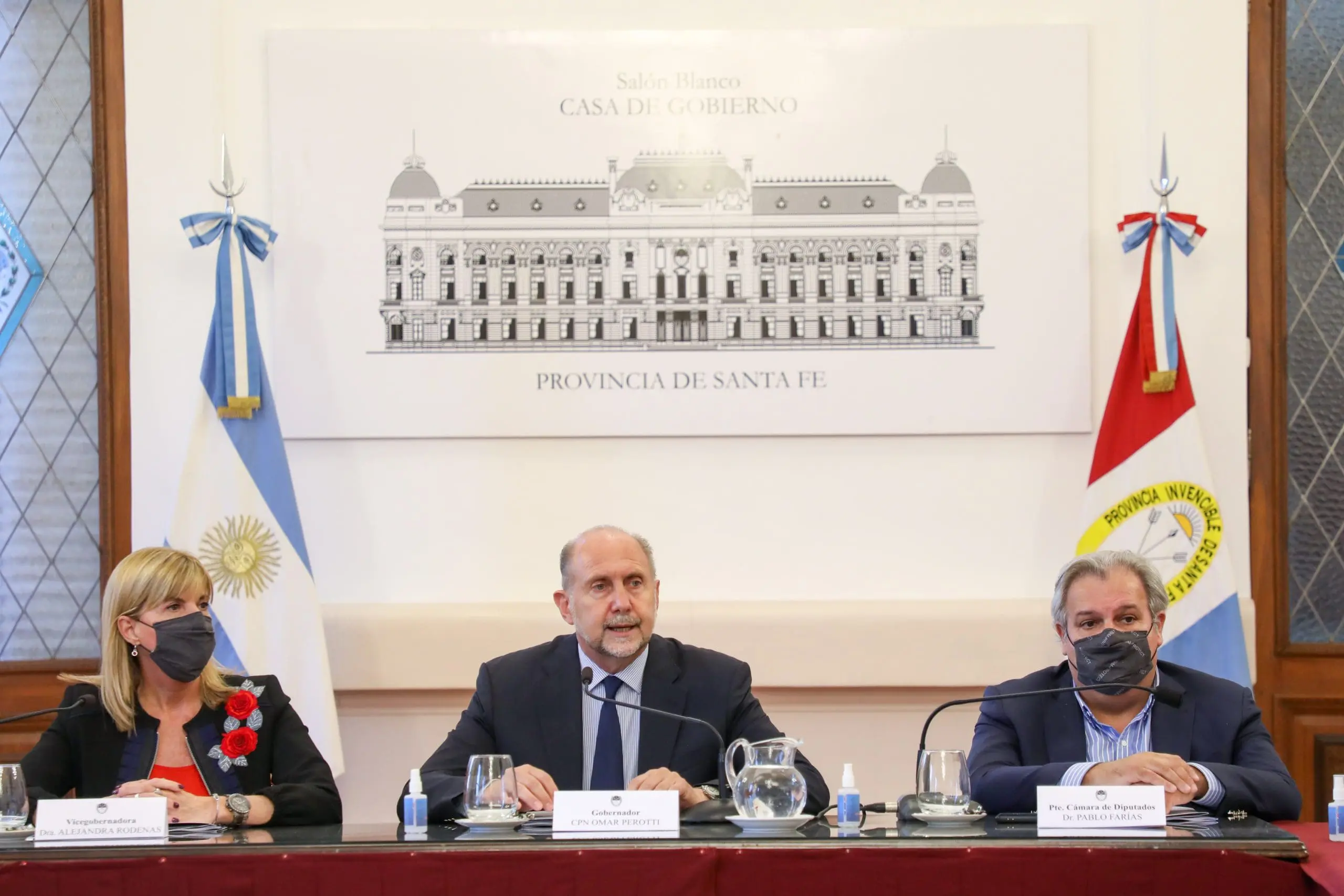 El gobernador de la provincia, Omar Perotti, se reunió este miércoles con representantes de los bloques de la Cámara de Diputados y los intendentes de las ciudades de Santa Fe, Emilio Jatón, y de Rosario, Pablo Javkin, para analizar las políticas de seguridad.