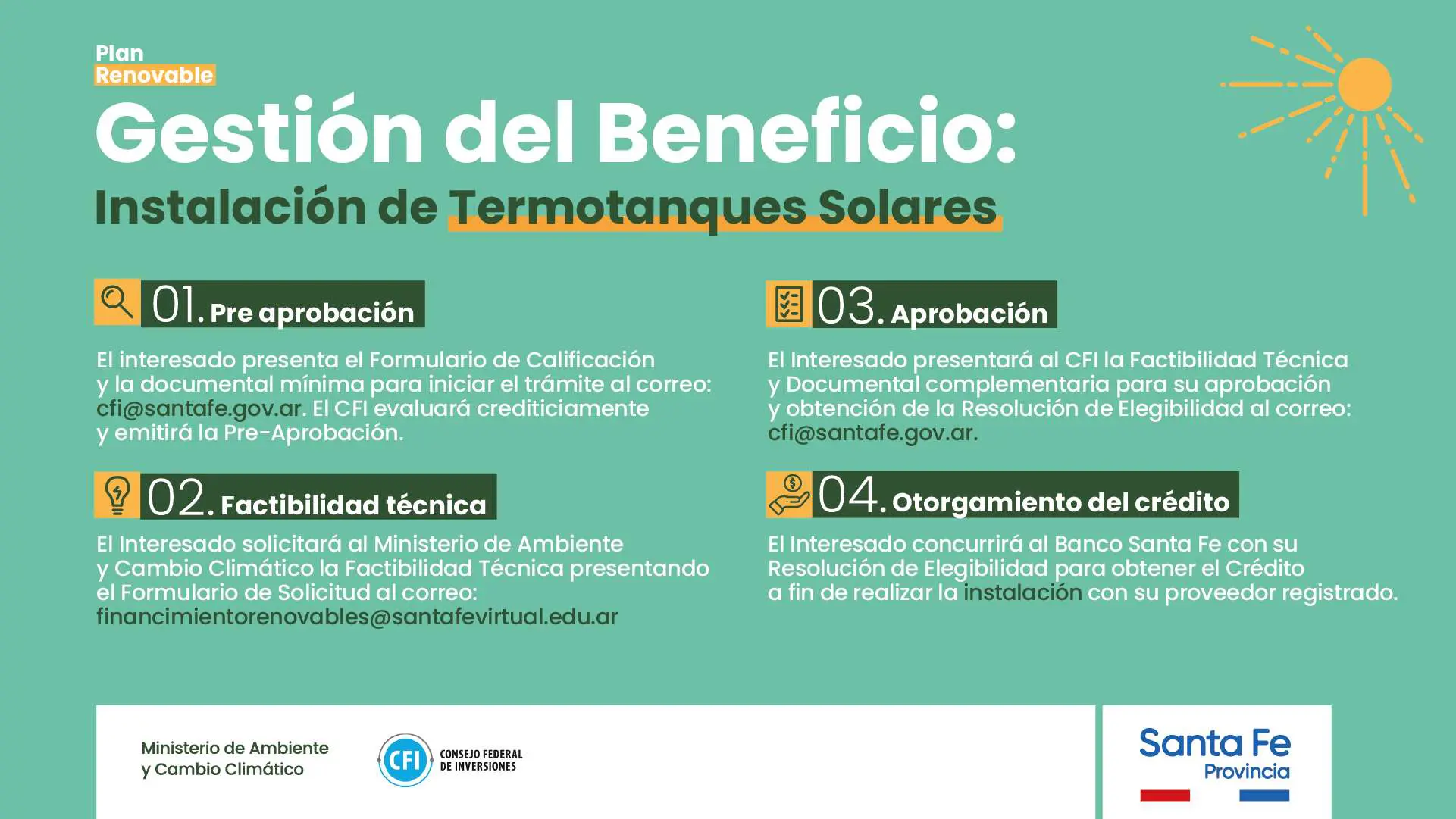 El programa, desarrollado por la cartera santafesina de Ambiente, implicará 400.000.000 pesos destinados a una serie de créditos para la compra e instalación de sistemas solares fotovoltaicos en el marco del Programa Energía Renovable para el Ambiente (ERA) y compra e instalación de termotanques solares. Los mismos están orientados a personas humanas, monotributistas y pymes y pueden inscribirse ingresando AQUÍ.