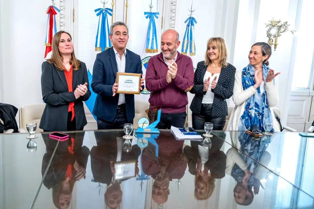 El intendente Pablo Javkin, junto a autoridades municipales y referentes de organizaciones sociales, participó este jueves 28 de septiembre del acto de reconocimiento a Rosario como ciudad donante, distinción formalizada por el Cudaio (Centro Único de Donación, Ablación e Implante de Órganos) por constituir una de las urbes que generan mayor cantidad de donantes del país, por promover sostenidamente la donación de sangre voluntaria como también la donación de órganos, tejidos y médula ósea, y porque desde diversas instituciones sociales, educativas y culturales se acompaña decididamente en instancias de sensibilización, capacitación y formación de la temática.