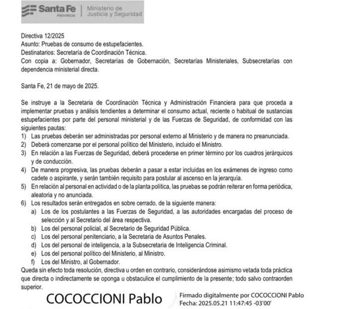 La medida se enmarca en el nuevo plan de fiscalización impulsado por esa cartera, que dispone la realización de narcotests sorpresivos, periódicos y no anunciados para policías, penitenciarios y autoridades políticas. La resolución fue firmada por el ministro Pablo Cococcioni, que también integra el padrón de personas sujetas a control y esta mañana realizó el suyo, también con resultados negativos. Solo durante la mañana de hoy, se realizaron alrededor de 30 narcotest.