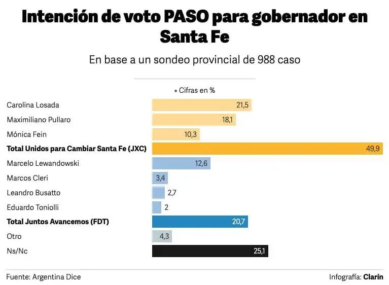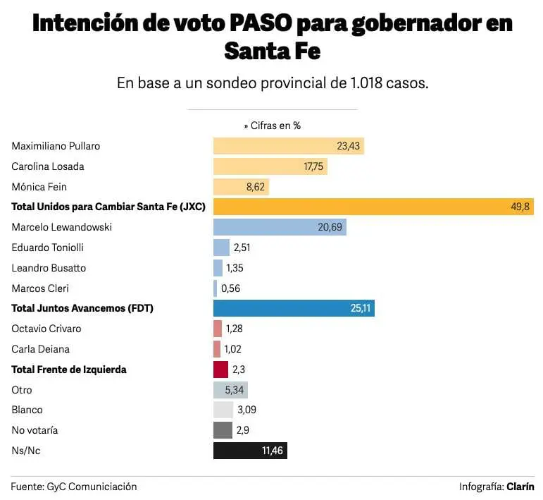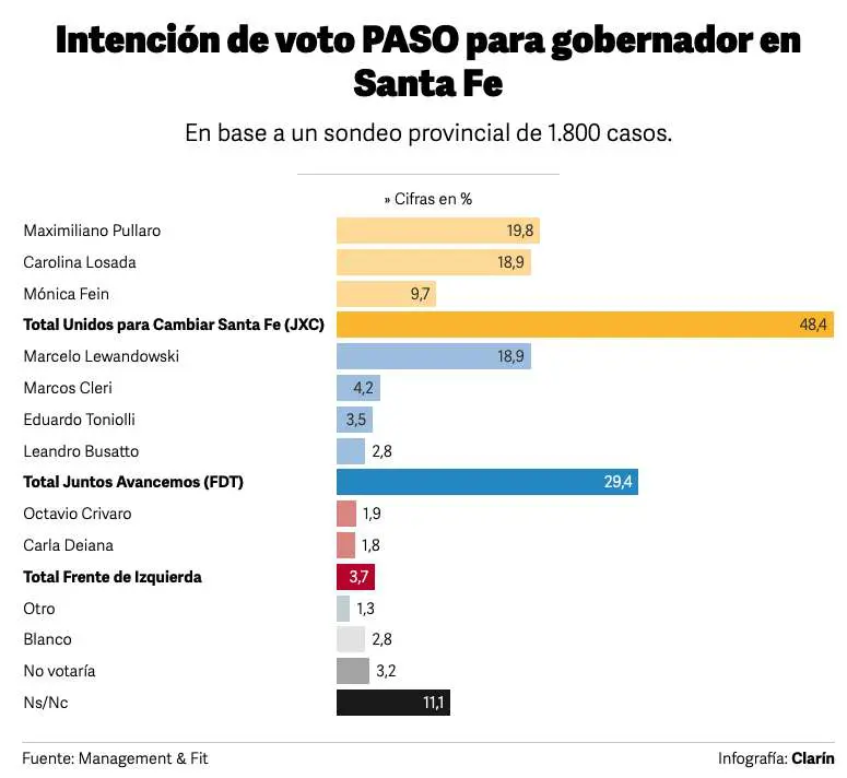 Cuatro de las cinco consultoras mencionadas midieron para la PASO a gobernador. Y todas dan una amplia ventaja a favor de Unidos para Cambiar Santa Fe, la alianza que unió a Juntos por el Cambio con el Partido Socialista.