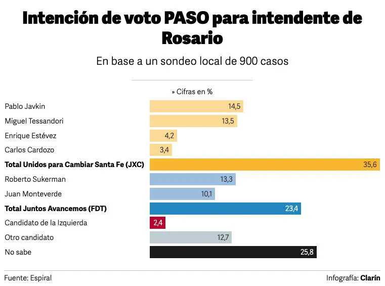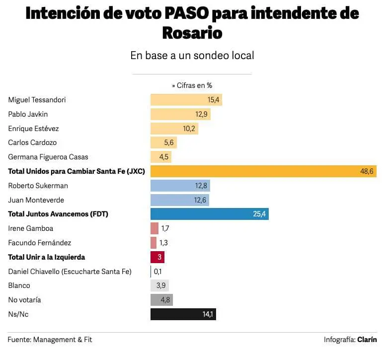 En cuanto a la pelea por la intendencia de Rosario (donde vota más del 30% del padrón provincial), la puja también está dentro de Unidos para Cambiar Santa Fe. En este caso, entre el actual intendente, Pablo Javkin, y el periodista local (y concejal) Miguel Tessandori.
