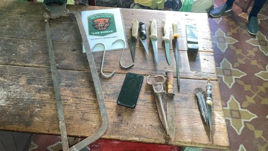En un megaoperativo coordinado entre “Los Pumas” de General López, la Policía de Investigaciones (PDI) región Venado Tuerto y la Patrulla Rural de General Arenales dependiente de la Policía de la provincia de Buenos Aires se secuestraron 1 Pick Up Toyota Hilux 4×4 color negra y otra S10 color blanca, 11 cuchillas, 21 cuchillos, 6 chairas, 9 teléfonos celulares, 9 ganchos, 3 sierras de carnicero de 1 metro,1 aparejo con gancho tipo percha, 1 mesa de aluminio de desposte, 6 bolsas con cortes de carne vacuna, 2 trozos cárnicos , cuerdas varias, 1 malacate, 1 pinza alicate, 1 hacha, 1 sierra sinfín eléctrica marca Bianchi y 2 hojas de sierra sinfín.