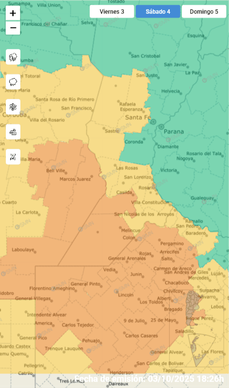 El Servicio Meteorológico Nacional (SMN) informó el pronóstico oficial de alertas y advertencias que regirá desde la tarde y noche del sábado 4 hasta la mañana del domingo 5 de octubre. Según el organismo, se esperan condiciones meteorológicas adversas en distintos puntos de la provincia de Santa Fe.