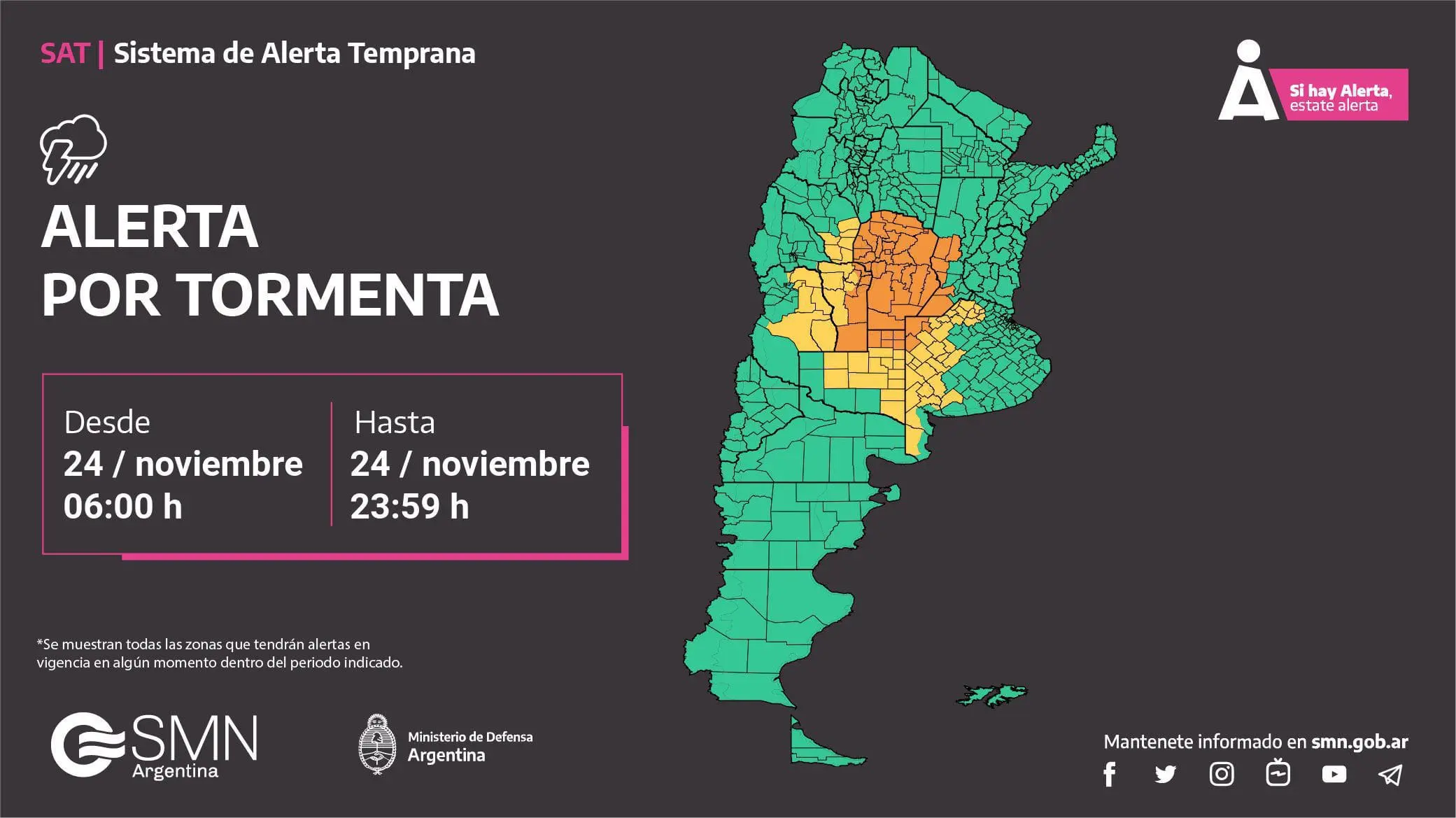 El Servicio Meteorológico Nacional emitió una alerta naranja por tormentas para la noche del miércoles 24 de noviembre que incluye los departamentos Belgrano, Castellanos, Las Colonias, San Martín, Caseros y General López.