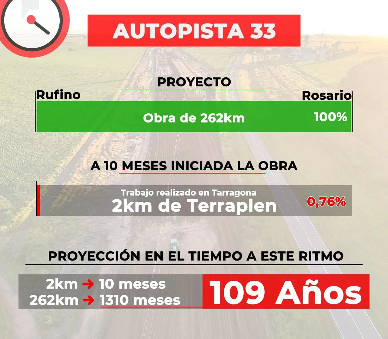 Hoy a poco más de 10 meses de haberse iniciado la construcción de la Autopista 33 cerca de Terragona – Rufino; sólo se trabajó en apenas 2 kilómetros y medio sobre los 220 kilómetros que totalizan este proyecto vial. Es decir; si en un año ni siquiera llegaron al 1% de su ejecución, el ritmo de obra refleja una proyección de 109 años para su finalización.