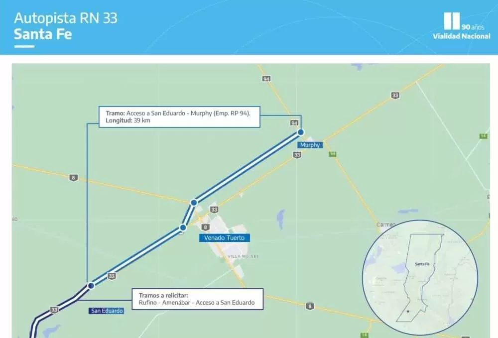 El Ministerio de Obras Públicas de la Nación, a través de Vialidad Nacional, adjudicó la obra de transformación en autopista de la Ruta Nacional 33, en el tramo comprendido entre el Acceso a San Eduardo y Murphy (RP 94).