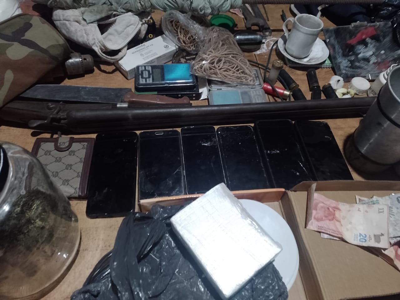 De la vivienda se secuestró, además de la motocicleta solicitada, una cantidad importante de una sustancia que podría ser cocaína, envoltorios con fracciones de esa sustancia blanquecina, plantas de marihuana, 2 revolver, 1 escopeta cal 16, municiones, cartuchos, celulares y procedieron a la aprehensión de dos hombres y una mujer.