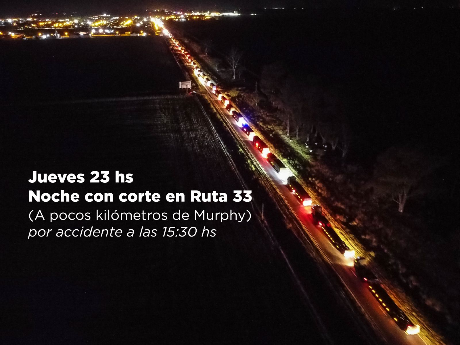 En este sentido, el Senador explicó que “este jueves por la noche, cerca de 23, regresando de las sesiones legislativas de Santa Fe; sobre la Ruta 33, a pocos kilómetros de Murphy (pasando Paraje Rabiola), vivimos un impactante amontonamiento de vehículos. Un embotellamiento como consecuencia de un nuevo accidente sobre esta peligrosa y desatendida traza 33. Pero lo más indignante de la situación, es que el lamentable accidente entre un auto y un camión cargado de cereal se produjo a las 15:30, casi ocho horas antes y me comentaron que ya era madrugada de viernes y aún estaba el corte”.