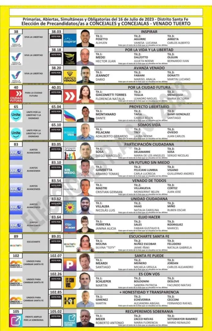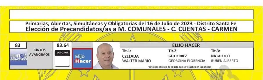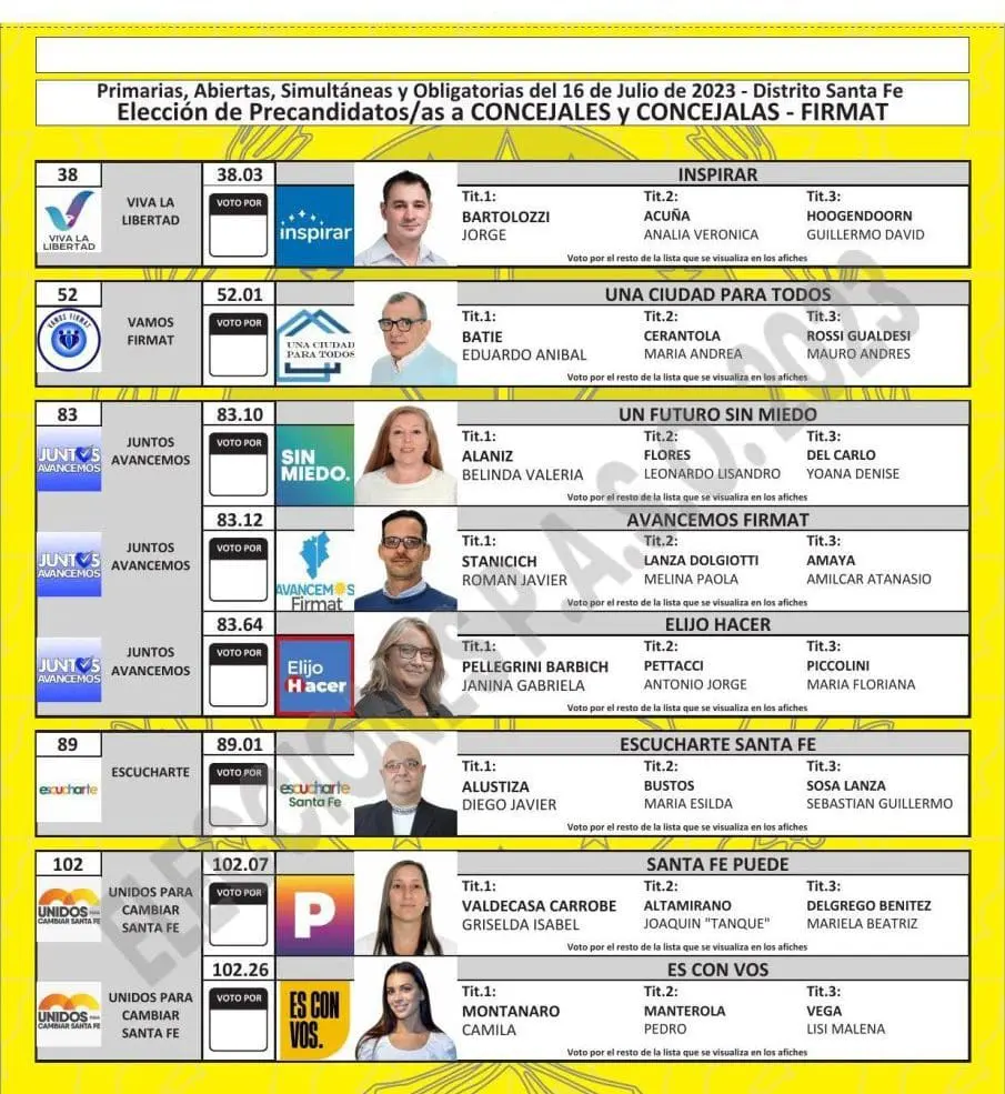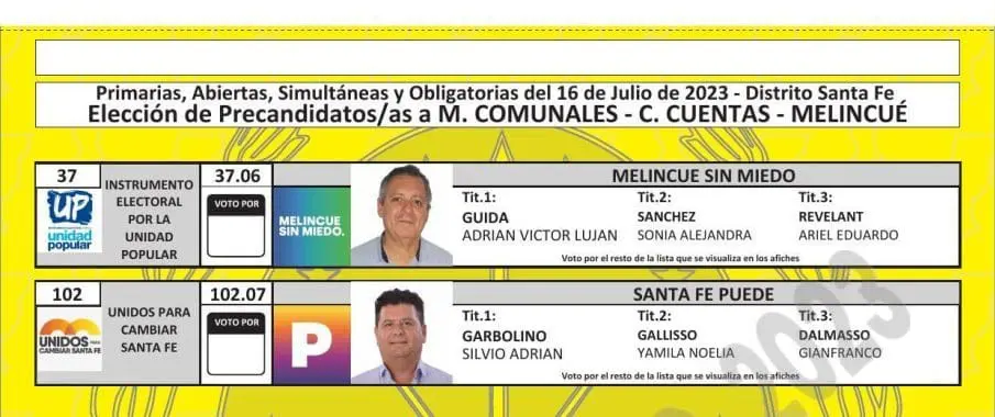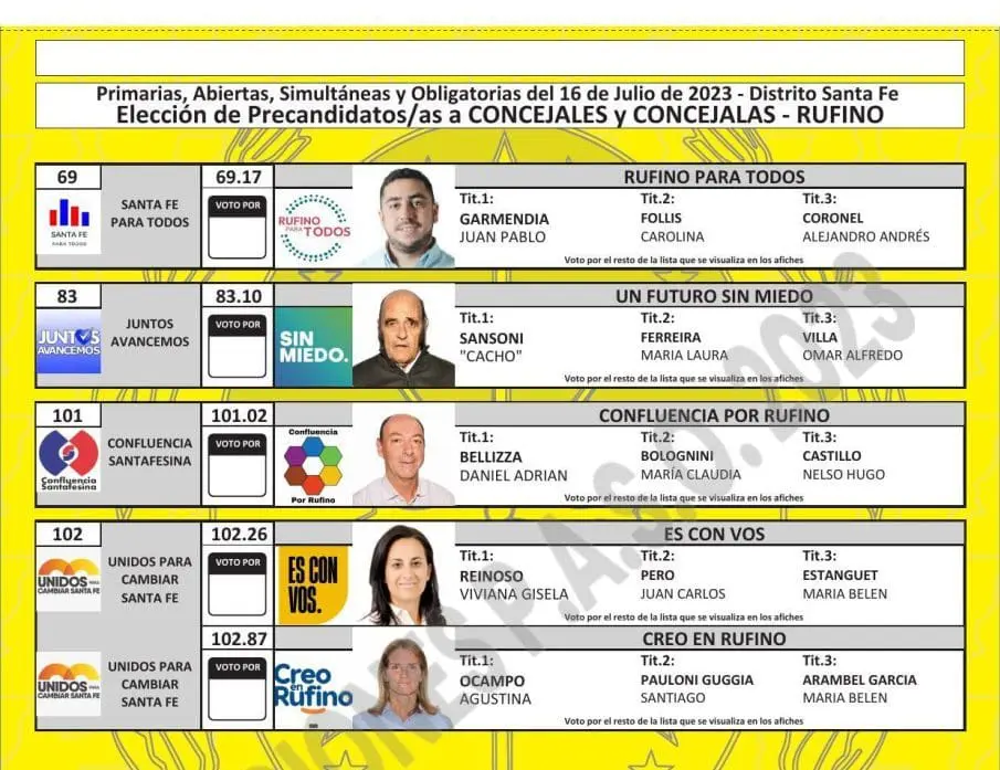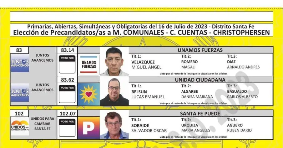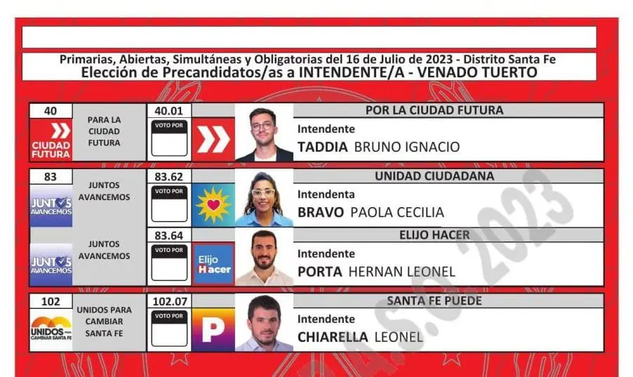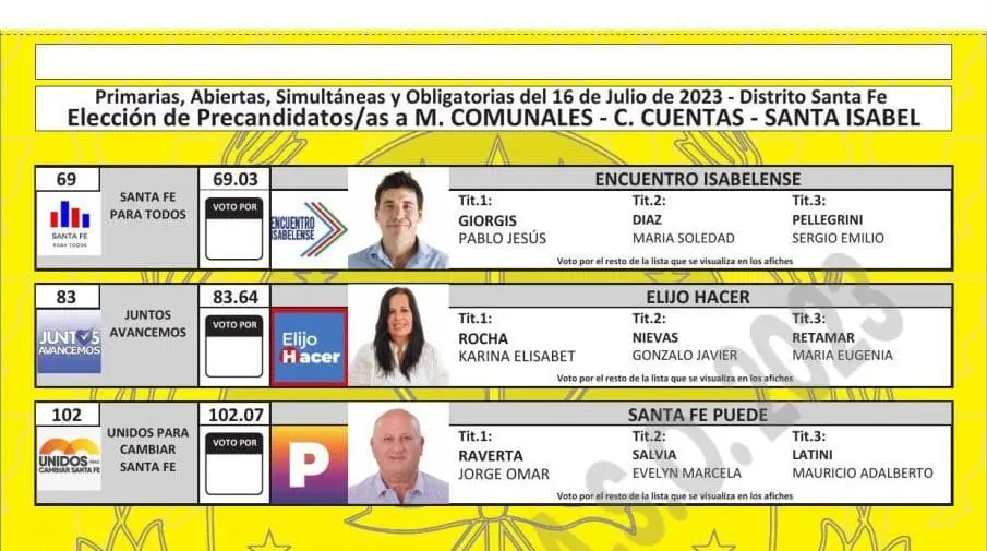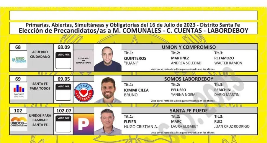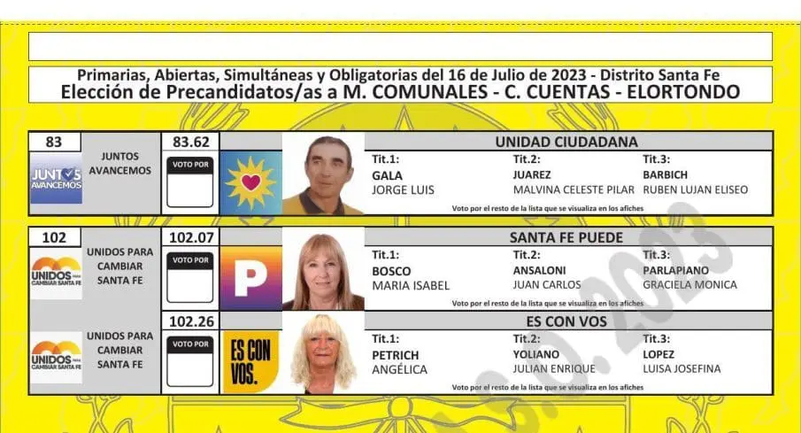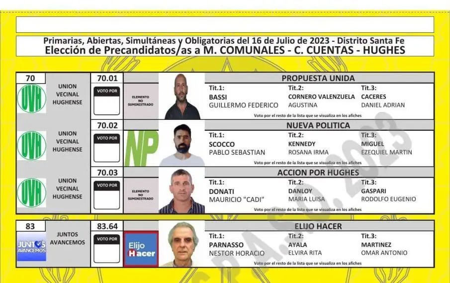 Una vez cumplimentadas las distintas instancias previstas en el cronograma electoral, como la oficialización de las listas, presentación de fotos de los candidatos, sorteo de las ubicaciones por frente electoral y listas, y también la determinación de los colores, ya quedaron confeccionadas las boletas para cada localidad.