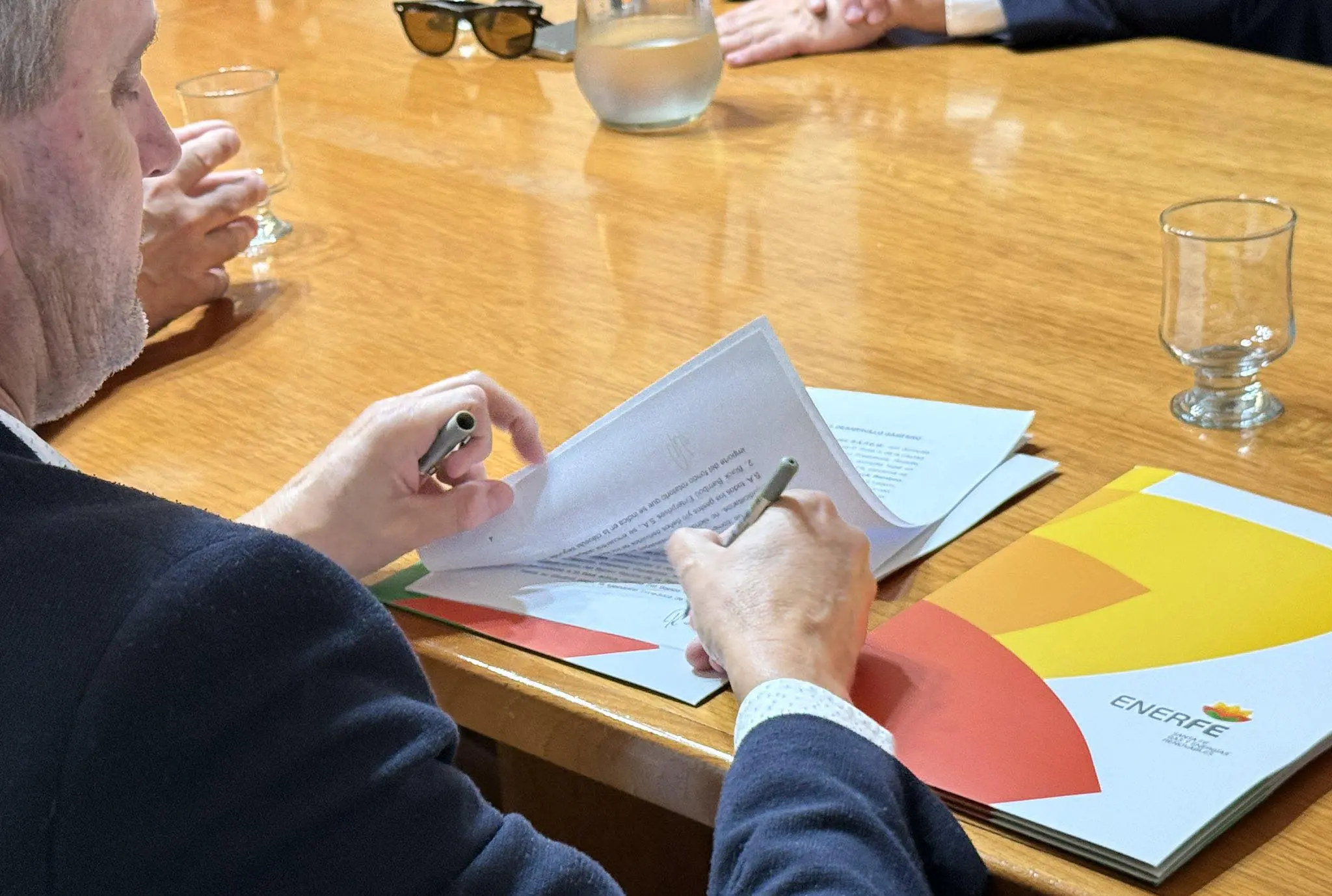 De la firma participaron el ministro de Desarrollo Productivo de Santa Fe, Gustavo Puccini; el presidente de ENERFE, Rodolfo Giacosa; el vicepresidente Diego Colono; el intendente de Hughes, Mauricio Donati, acompañado por el secretario y tesorero comunales; y representantes de las empresas intervinientes: por el Frigorífico Black Bamboo, Federico Lequio y Leonardo Lequio; por Ser Agro, Martín Brandi y Fernando Franco; además de autoridades de la Asociación de Cooperativas Argentinas (ACA) y del Centro Agropecuario Modelo (CAM).