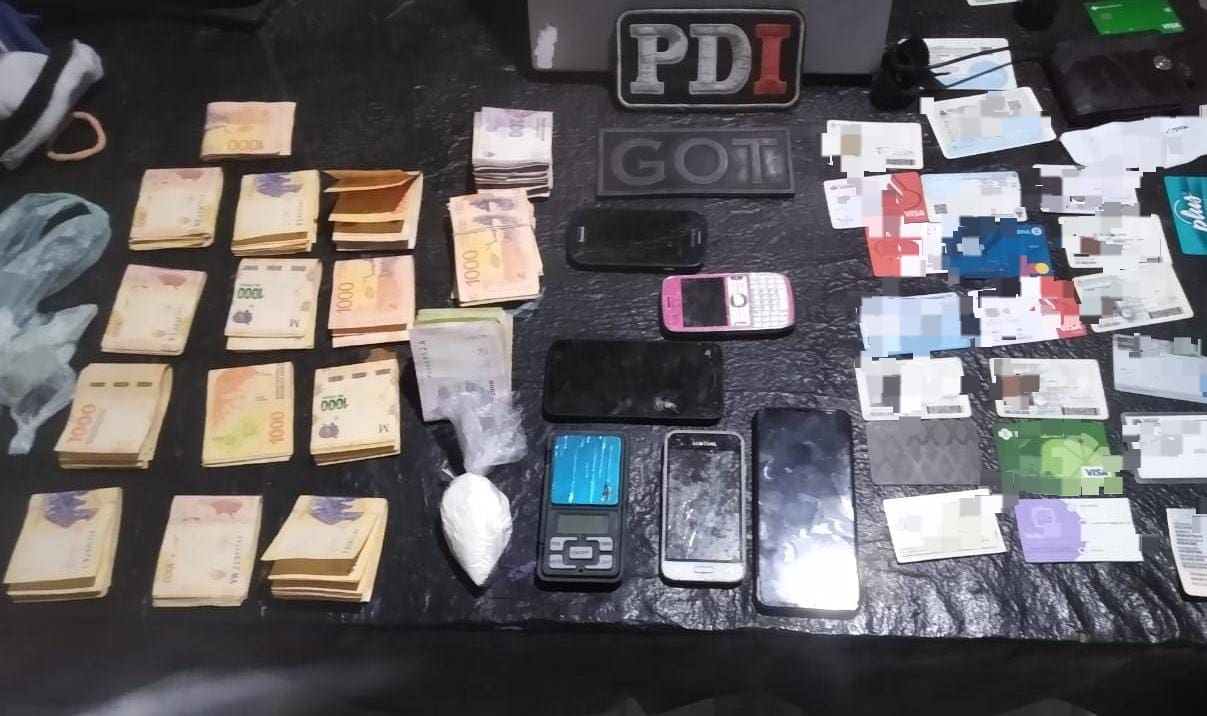 Efectivos de la PDI procedieron a la aprehensión de Fabián N., Diana V., Alejandro C., Florencia C., Gabriel F., y Graciela S. Además secuestraron cocaína por un pesaje total de 2106 gramos, un envoltorio y dos plantines de marihuana, elementos de fraccionamiento, dinero en efectivo por 1.896.260 pesos, 2001 dólares, telefonía celular, tres automóviles, dos balanzas y dos máquinas contadoras de billetes.