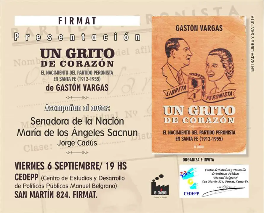 La Senadora Nacional María de los Angeles SACNUN acompañará este viernes 6 de septiembre a las 19hs la presentación del libro “Un Grito de Corazón. El Nacimiento del Partido Peronista en Santa Fe (1912-1955)” escrito por el autor alcortense Gastón Vargas.