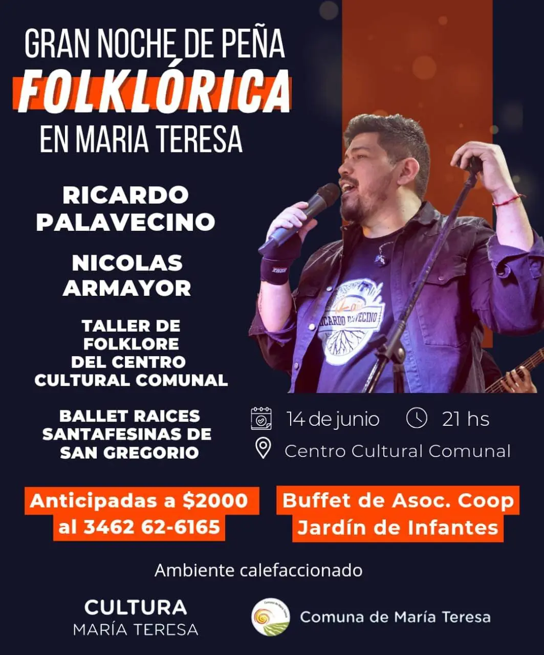 Organizado por el Área de Cultura de la Comuna de María Teresa, el próximo viernes 14 de junio, a las 21 hs, se llevará a cabo una nueva peña folklórica en el Centro Cultural Comunal. Este evento promete ser una noche llena de música, danza y tradición, con una destacada alineación de artistas y actividades para todos los gustos.