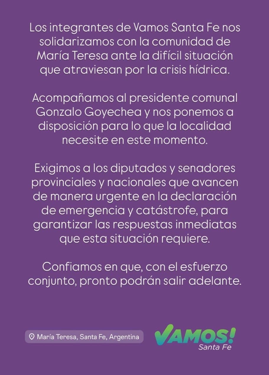 Intendentes y presidentes comunales de la región manifestaron su solidaridad con la localidad de María Teresa ante la grave crisis hídrica que atraviesa y exigieron respuestas inmediatas de los gobiernos provincial y nacional.