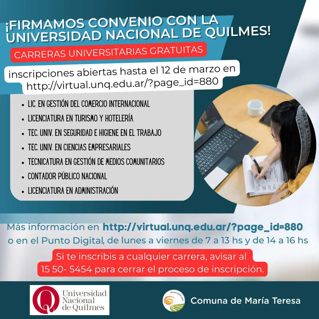 La comunidad de María Teresa suma una nueva oportunidad para poder estudiar una carrera universitaria desde su propio terruño, esta vez con la firma de un convenio con la Universidad Nacional de Quilmes.