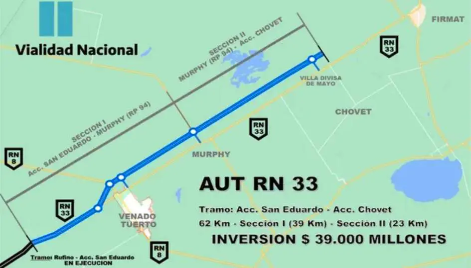 Antes de fin de año, el Ministerio de Obras Públicas de la Nación prevé licitar un nuevo tramo de la autopista Ruta Nacional Nº 33. Se trata de un trayecto de 39 kilómetros entre el acceso a San Eduardo y Murphy, el cual se sumará a la traza que ya se está construyendo en la zona de Rufino.