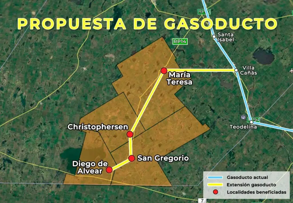 Una de estas obras es la ampliación del gasoducto sur, ubicado en la Ruta Provincial N° 14, para la provisión de gas a las localidades de María Teresa, Christophersen, San Gregorio y Diego de Alvear, dicho proyecto requiere de una importante y necesaria inversión y es solicitado por Enrico por segundo año consecutivo.
