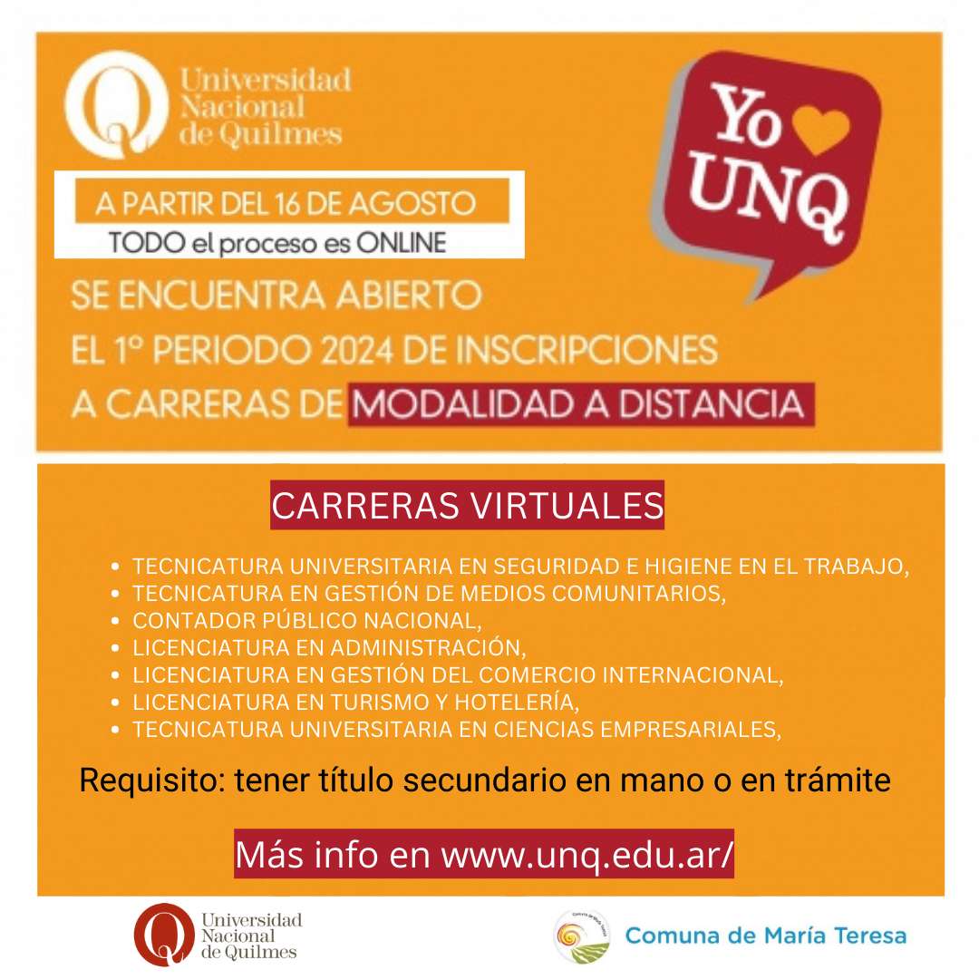 Es importante destacar que la firma de este convenio, entre comuna y universidad, garantiza la gratuidad del acceso a la educación superior a distancia para todos los habitantes de María Teresa. La oferta educativa para el año 2024, inscripción que se encuentra abierta desde el 16 de agosto hasta el 17 de setiembre de 2023, es la siguiente: Tecnicatura Universitaria en Seguridad e Higiene en el Trabajo, Licenciatura en Ciencias Sociales y Humanidades (CCC), Licenciatura en Educación (CCC), Licenciatura en Geografía, Tecnicatura en Gestión de Medios Comunitarios, Contador Público Nacional, Licenciatura en Administración, Licenciatura en Gestión del Comercio Internacional, Licenciatura en Turismo y Hotelería, Tecnicatura Universitaria en Ciencias Empresariales, Licenciatura en Artes y Tecnologías (CCC).