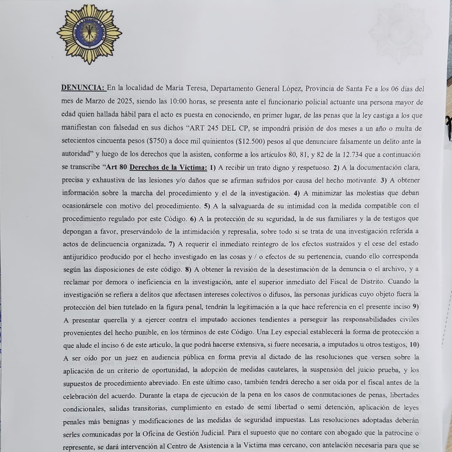 Durante el acto, el funcionario policial encargado explicó al denunciante las implicancias legales de presentar información falsa, de acuerdo al artículo 245 del Código Penal, y le hizo del conocimiento de los derechos que amparan a la víctima conforme a lo dispuesto en el Código 12.734. Esta lectura incluyó garantías de trato digno, información detallada sobre el procedimiento y protección de la intimidad, entre otros aspectos fundamentales.