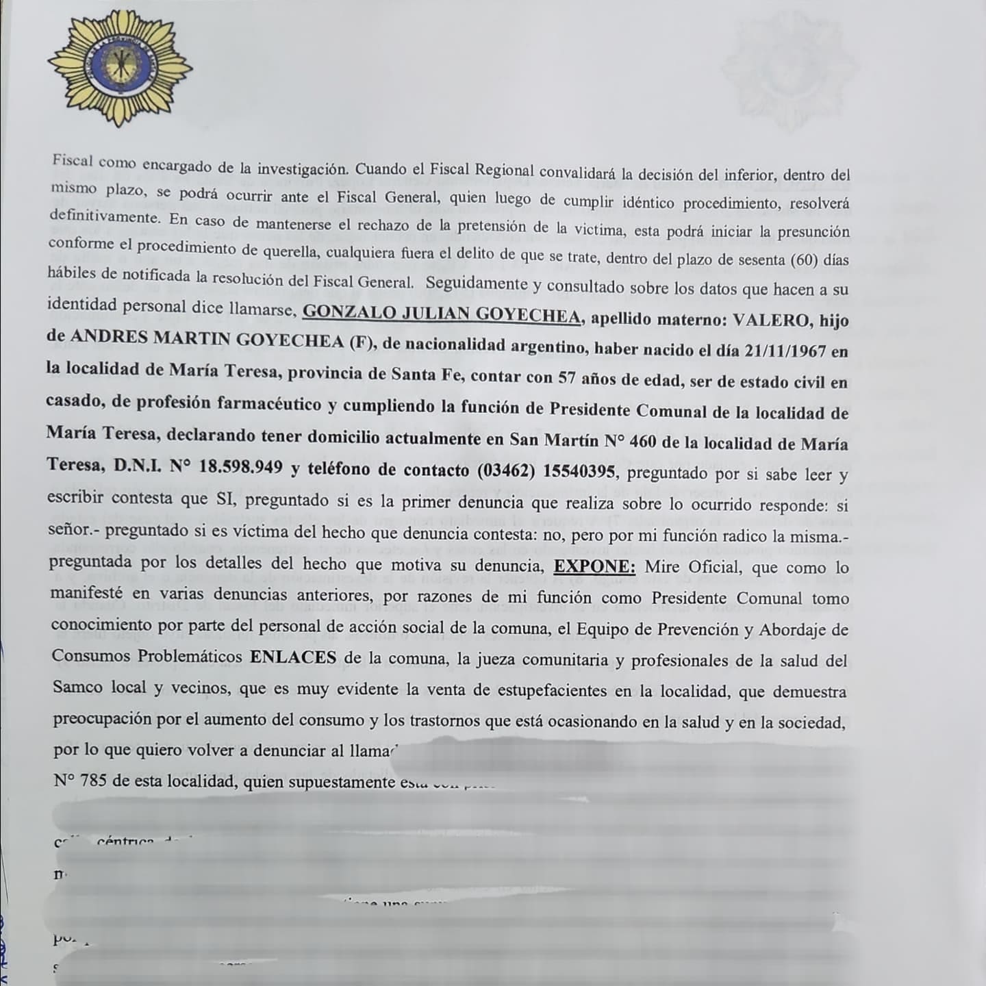 La denuncia se formalizó tras la verificación de la información recibida por parte del personal de acción social, el Equipo de Prevención y Abordaje de Consumos Problemáticos ENLACES, la jueza comunitaria y profesionales de la salud del SAMCO local, así como por el testimonio de vecinos preocupados por la impunidad. Goyechea, afirmó que su función lo obliga a colaborar estrechamente con las autoridades para poner fin a la actividad ilícita.