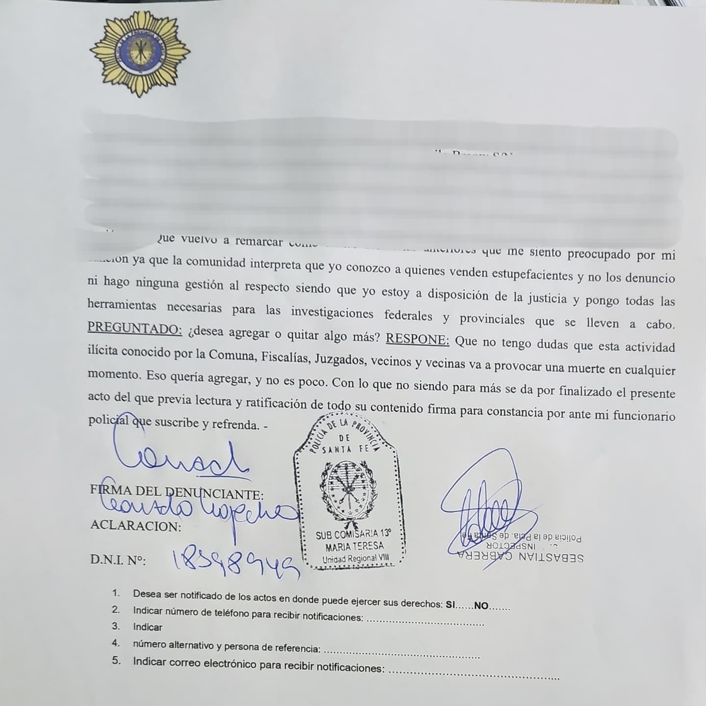 El presidente comunal de María Teresa, Gonzalo Goyechea, presentó este jueves 6 de marzo una nueva denuncia formal ante la Sub Comisaría 13°, alertando sobre la creciente presencia de venta de estupefacientes en la localidad. Según manifestó, la situación ha alcanzado niveles inaceptables, ya que a pesar de denuncias previas y detenciones, la reincidencia de los involucrados continúa, generando alarma en distintos sectores de la comunidad.