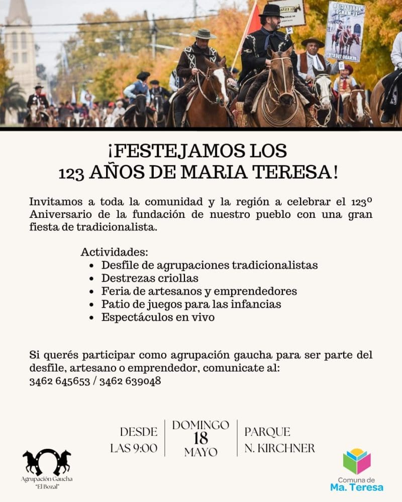 María Teresa se prepara para vivir una jornada muy especial: el próximo domingo 18 de mayo, en el Parque Comunal Néstor Kirchner, se celebrará el 123° aniversario de su fundación con una gran fiesta popular, de entrada libre y gratuita.