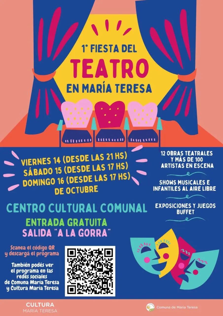 El próximo 14, 15 y 16 de octubre, se realizará la primera Fiesta de Teatro en la localidad de María Teresa. Organizada por el Área de Cultura de la Comuna de María Teresa, durante los tres días «tendremos 12 obras de teatro, locales y de la región, y más de 100 artistas en el escenario», contó Daniela Varela, secretaria de cultura. Además, informó que habrá shows musicales e infantiles al aire libre, servicio de buffet los tres días y la entrada será gratuita.