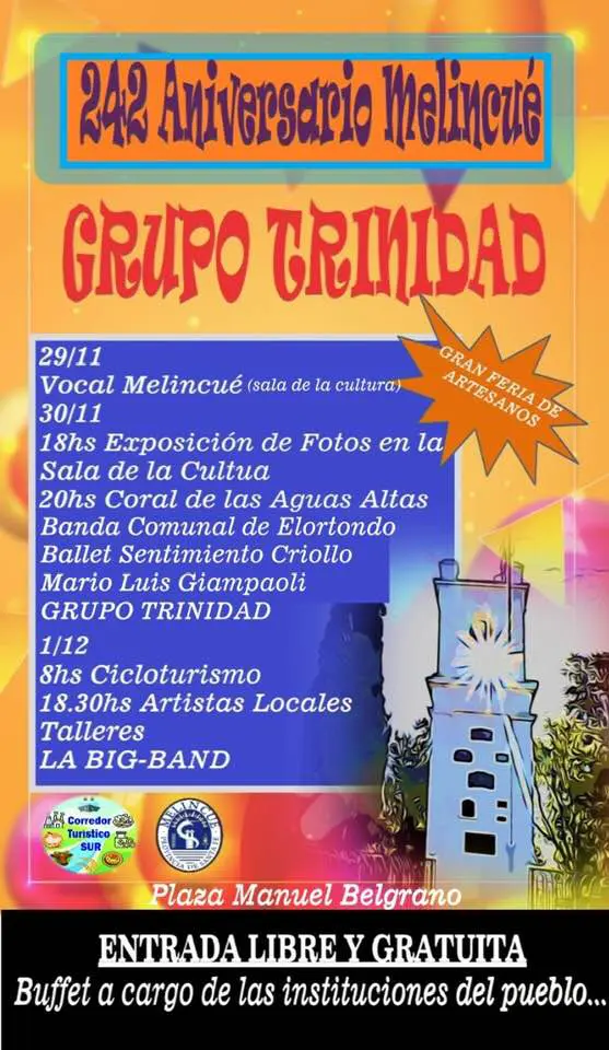 Las actividades comenzarán el viernes, cuando actúe el grupo Vocal Melincué en la sala cultural. El sábado habrá una exposición de fotos sobre las aves de la localidad, y a partir de las 18 horas habrá feria de artesanos y expositores con un sector especial destinado al Corredor Turístico del Sur. Más tarde actuará el coro de Melincué, la banda de Elortondo, Mario Sanpauli y cerrará la agrupación Trinidad.