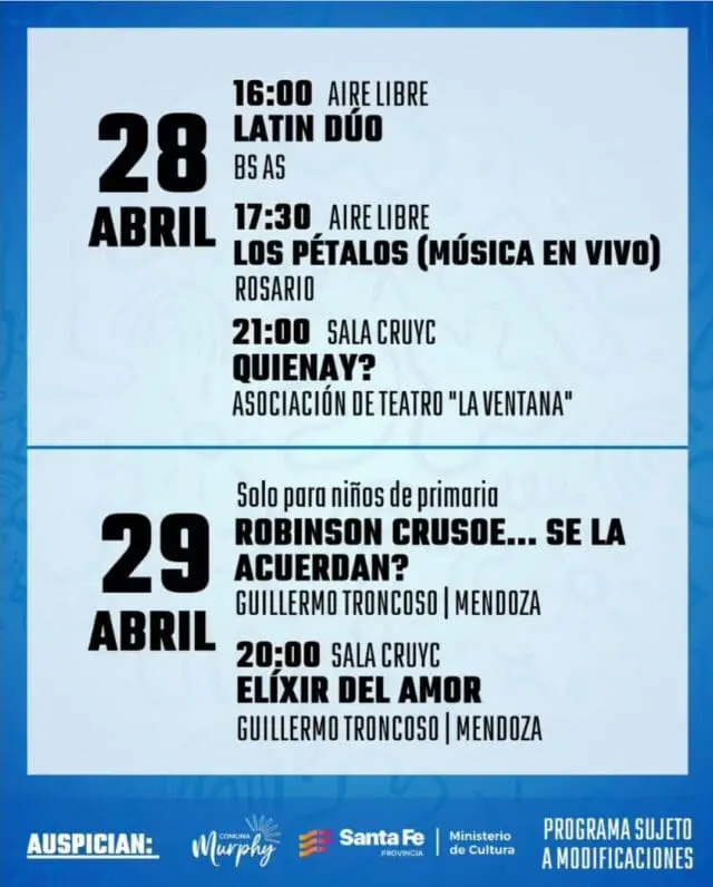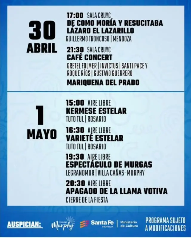 Hasta el miércoles 1° de mayo se desarrollará la Fiesta Homenaje al Teatro Independiente de Murphy, en su 29° edición, con la participación de artistas que llegan desde la región y diferentes puntos del país para mantener encendida la llama del teatro en un pueblo que toma este encuentro como su gran evento anual. La organización está a cargo del Grupo La Ventana, en conjunto con la Comuna de Murphy y el apoyo del Ministerio de Cultura de Santa Fe. En esta oportunidad estuvo presente el gobernador Maximiliano Pullaro.