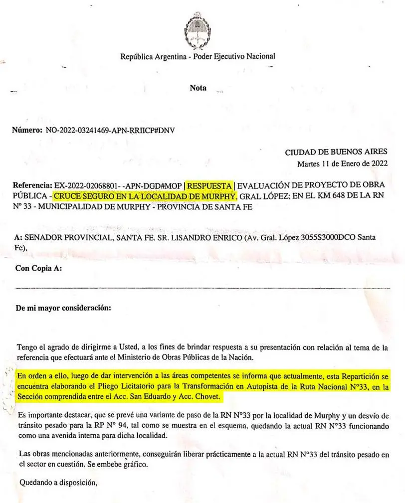 Ante el reiterado pedido del senador Lisandro Enrico para que se repare el cruce ferroviario de la localidad de Murphy, el Gobierno Nacional respondió a esta solicitud informando que se encuentran elaborando el pliego licitatorio para la transformación en autopista de la Ruta Nacional 33, una solución a futuro que no responde a las necesidades inmediatas de un cruce seguro en la localidad.