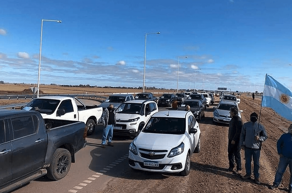 Por su parte, los aproximádamente 500 productores que tenían previsto protestar con una caravana llegaron en sus vehículos a las inmediaciones de donde se desarrollaba el acto e hicieron sonar sus bocinas en señal de disconformidad. El operativo de seguridad montado en el lugar impidió que los manifestantes pudieran acercarse más.