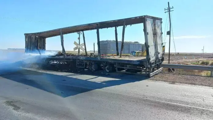 Así quedó el camión tras el incendio provocado por la colisión con el tren, anoche sobre Ruta 7. En la noche del domingo se produjo un accidente en Ruta Nacional N° 7, kilómetro 428 en el paso a nivel sentido Rufino-Laboulaye. El mismo fue protagonizado por un camión y un tren.